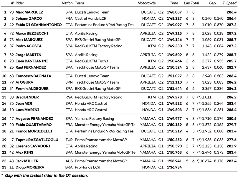 Така Бедзеки остана четвърти и ще раздели втория ред с миналогодишния победител в Гран При на Испания Алекс Маркес и Педро Акоста. Хорхе Мартин, който ще бъде преместен с три места назад на старта утре, се класира седми в квалификацията пред Енеа Бастианини и Раул Фернандес, които заеха осмото и деветото място. Франческо Баная, Ай Огура и Фермин Алдегер бяха най-бавни в решителните 15 минути на битката за полпозишъна, в които Алдегер, Алекс Маркес, Мартин и Бастианини направиха по едно падане.