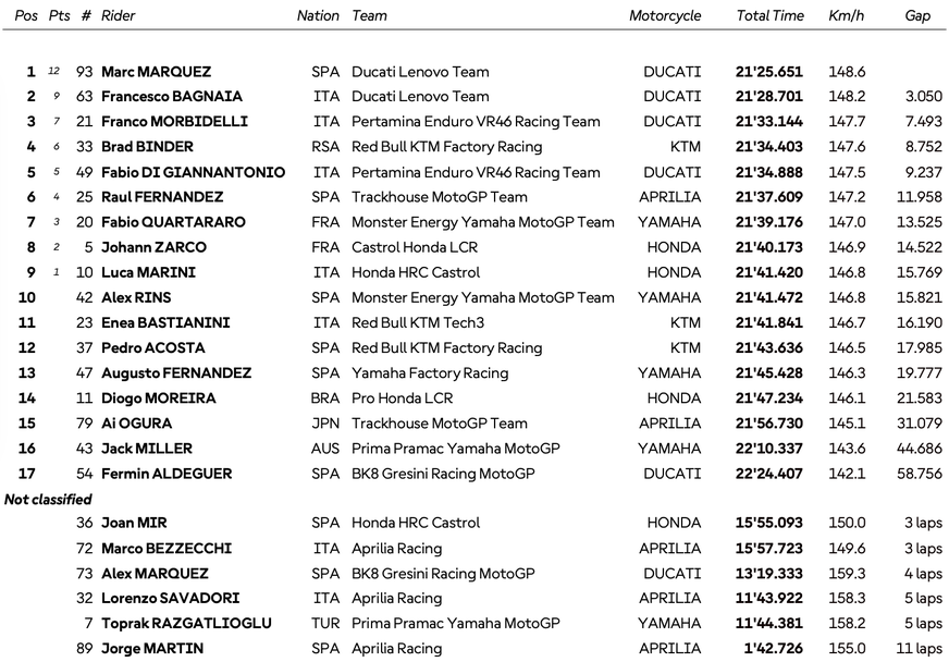 При пресичането на финалната линия испанецът завърши на 3.050 секунди пред Баная, който се класира втори, а тройката на 7.493 зад победителят допълни Морбидели. След падането си Биндър все пак се пребори за четвъртата позиция пред Ди Джанантонио, Раул Фернандес, Фабио Куартараро, Йоан Зарко и Лука Марини.