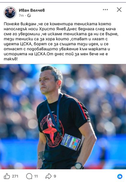 "Понеже виждам, че се коментира тениската, която напоследък носи Христо Янев. Днес, веднага след мача сме го уведомили, че искаме тениската да ни се върне. Тези тениски са за хора, които стават и лягат с идеята за ЦСКА, борят се за същата идея и се отнасят с подобаващото уважение към марката и историята на ЦСКА. От днес той за мен вече не е такъв!", написа лидерът на сектор "Г" Иван Велчев.
