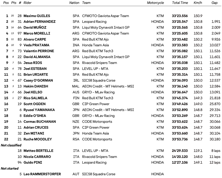Индонезиецът Веда Пратама прогресира с общо 11 позиции в хода на днешното състезание, за да завърши шести пред Валентин Пероне, Давид Алманса, Хесус Риос и Естебан, които оформиха челната десетка. В зоната на точките влязоха още Брайън Уриарте, Кейси О'Горман, Хаким Даниш, Джоел Келсо и Рико Салмела.