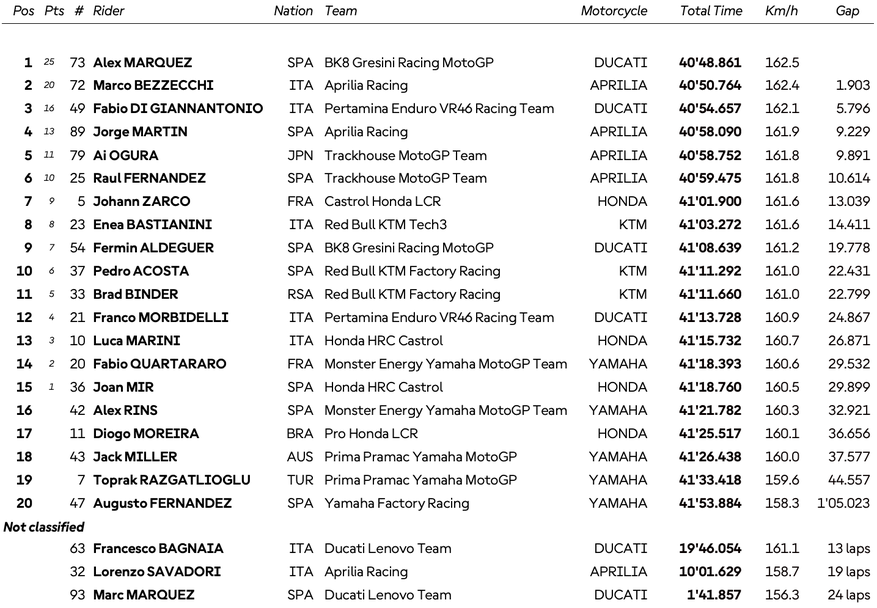 До финала Алекс Маркес практически кара необезпокояван и спечели с аванс от 1.9 секунди пред Бедзеки, който загуби първи неделни точки от началото на сезона. Трети на подиума се качи Фабио Ди Джанантонио, а в топ 5 влязоха още Хорхе Мартин и Ай Огура, който изпревари съотборника си в Тракхаус Априлия Раул Фернандес във финалния тур.