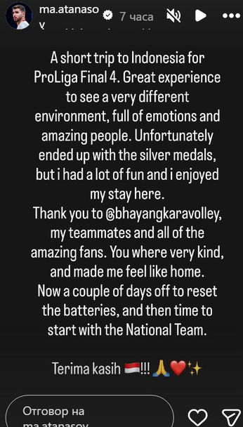 "Кратко пътуване до Индонезия за финалната четворка на Proliga. Страхотен опит да видя една много различна атмосфера, пълна с емоции и невероятни хора. За съжаление завършихме със сребърните медали, но се забавлявах много и се наслаждавах на престоя си тук. Благодаря на @bhayangkaravolley, съотборниците ми и всички невероятни фенове. Всички бяхте много мили и ме накарахте да се чувствам като вкъщи. Сега няколко дни почивка да заредя батериите и след това започвам с националния отбор. Благодаря ви!!!", написа Атанасов в личния си профил в Инстаграм.