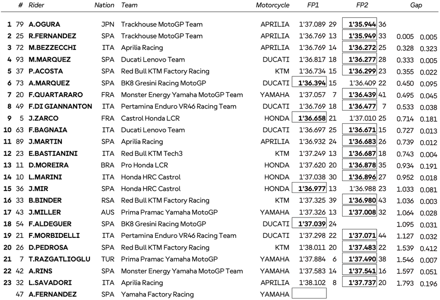 Най-бърз изпитателния ден беше пилотът на Тракхаус Априлия Ай Огура, който мината преди развяването на карирания флаг завъртя обиколка за 1:35.944, с която изпревари с 0.005 секунди своя съотборник Раул Фернандес. Тройката с пасив от 0.328 спрямо японския състезател допълни заводският пилот на Априлия и лидер в генералното класиране в MotoGP Марко Бедзеки.