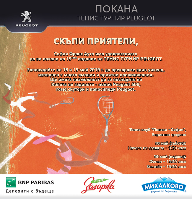 Близо 60 двойки от цялата страна ще се впуснат в надпреварата на кортовете на Тенис клуб „Левски – София“ този уикенд. Колата на годината – Peugeot 508, ще стане свидетел на тенис мачовете. Новите велосипеди и скутери на марката, ще бъдат на разположение на участници и посетители.